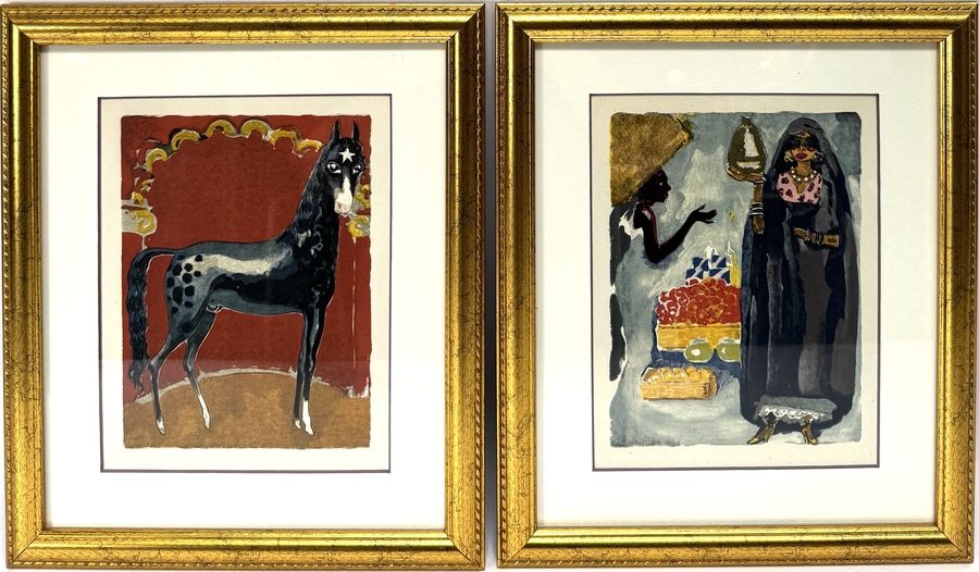 Twee kleurenhoutsneden van Kees van Dongen (1877–1968), gedrukt in 1955 door Ateliers S.A. Coulouma te Parijs. Eén werk toont een gestileerd zwart paard in een decoratief circusachtig decor, het andere een marktscène met een gesluierde vrouw en koopwaar. Beide prenten zijn omlijst en gemonteerd met passe-partout. Expressieve stijl en karakteristiek kleurgebruik.