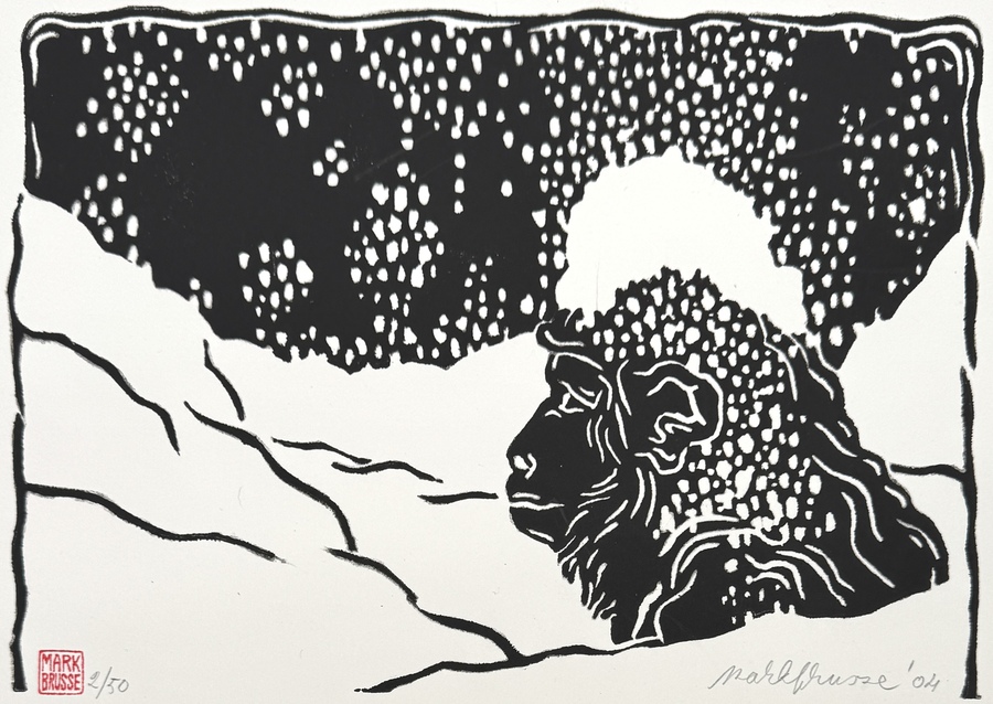 Linosnede door Mark Brusse (geboren 1937), uitgevoerd in zwart op wit papier. Afgebeeld is een makaak zittend in een besneeuwd landschap, opgebouwd uit vlakverdelingen en grafische patronen. Rechtsonder met potlood gesigneerd en gedateerd ‘04, linksonder met rood stempel Mark Brusse en met potlood genummerd oplagenummer 2/50.