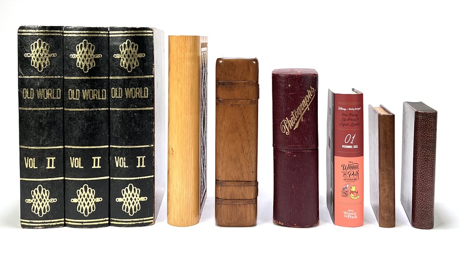 Groep van zeven boeksimulanten, eind 20e eeuw tot begin 21e eeuw, uitgevoerd in hout, bedrukt karton, fineer of kunststof. Verschillende stijlen waaronder imitatieleren ruggen, gedrukte decoraties en scharnierende constructies. Onder meer met opdrukken “Old World” en “Winnie the Pooh”, deels met opbergfunctie.
