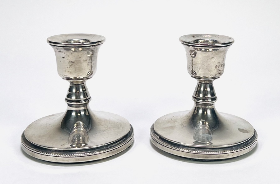 Paar zilveren kandelaars in neoklassieke stijl, uitgevoerd in 925/1000 zilver, gemerkt aan de onderzijde met 925, meesterteken, en INDUSTRIA ARGENTINA. Uitgevoerd met geprofileerde voet, gladde stam en groene vilten onderzijde. Datering midden 20e eeuw.