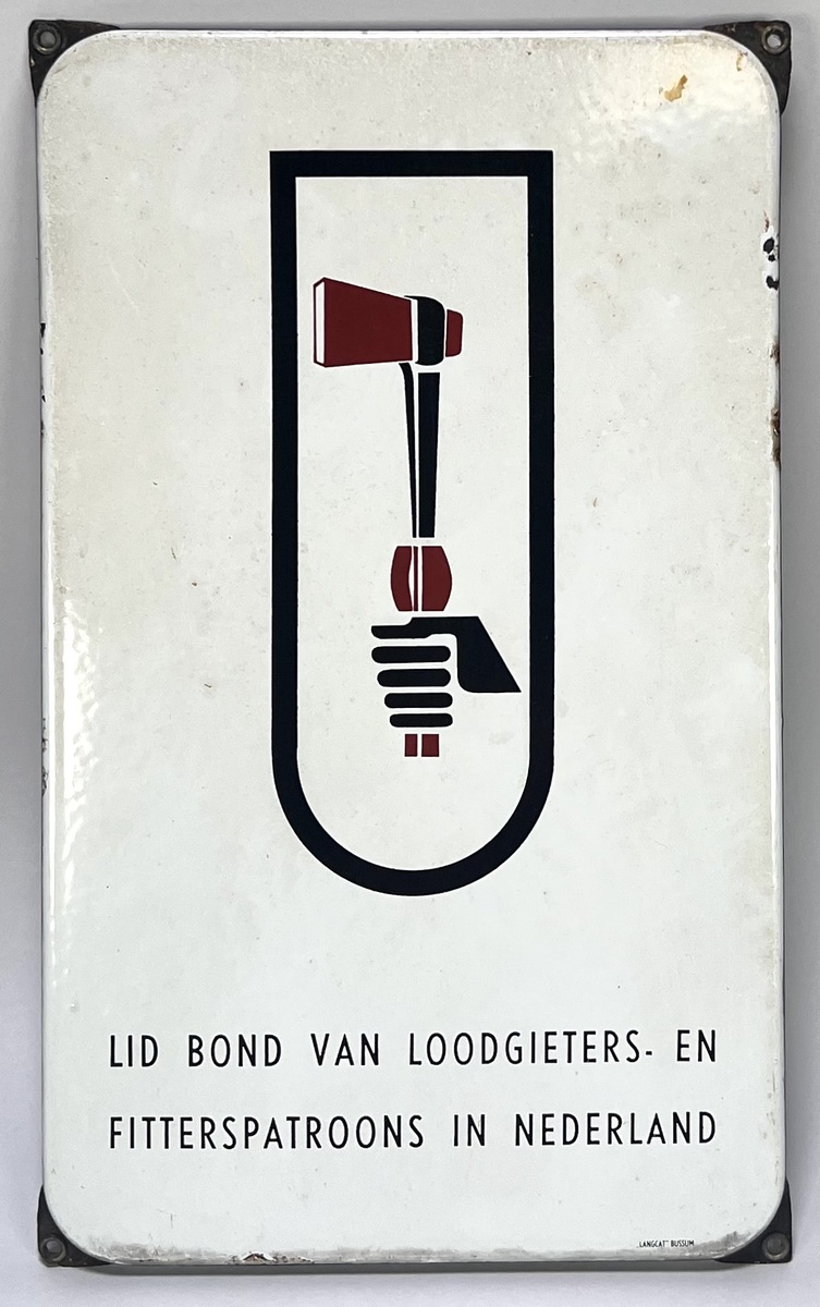 Geëmailleerd metalen bord met het logo van de Bond van Loodgieters- en Fitterspatroons in Nederland, uitgevoerd in zwart en rood op witte ondergrond. Midden 20e eeuw. Met vier ophanggaten en rechtsonder in druk gesigneerd Langkat Bussum.