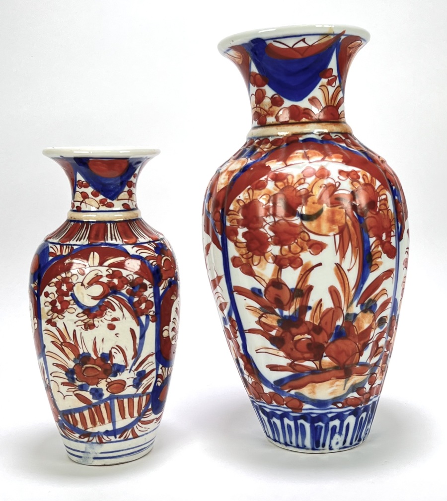 Twee Imari handbeschilderde vazen, circa 1900–1920, Japan. Uitgevoerd in keramiek met decoratie in rood, kobaltblauw en wit, voorzien van florale motieven in cartouches en geometrische randen. Bolvormig lichaam met uitlopende hals.