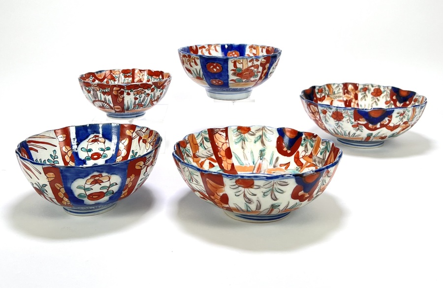 Set van vijf Imari gelobde porseleinen kommen met handgeschilderde florale motieven in blauw, rood en goud. Afkomstig uit Japan, eind 19e eeuw tot begin 20e eeuw.