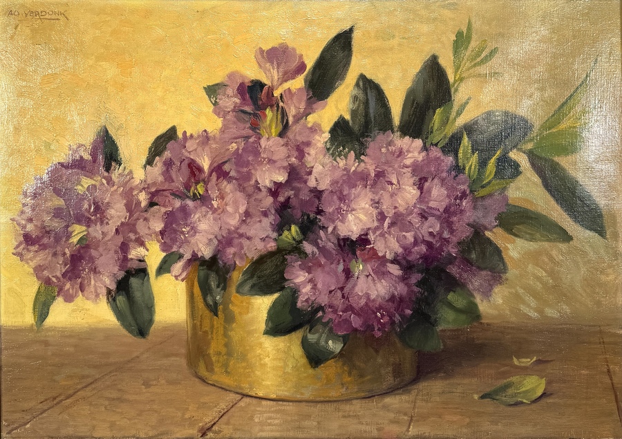 Schilderij in realistische stilleven van Ad Verdonk (1894–1977), uitgevoerd in olieverf op doek. Afgebeeld is een goudkleurige schaal met paarse hortensia’s en groene bladeren op een houten tafel, tegen een geel getinte achtergrond. Linksboven gesigneerd Ad Verdonk in bruine verf. Het werk is opgespannen op houten spieraam met etiketteerrest van Kunsthandel Ongering.