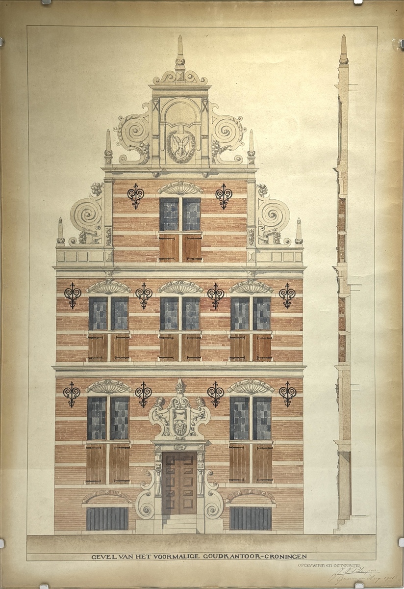 Architecturale aquarel uit augustus 1912, die de gevel van het voormalige Goudkantoor in Groningen voorstelt. Het werk is in inkt en aquarel op papier uitgevoerd, waarbij de stijl van de Nederlandse renaissance gedetailleerd is weergegeven. De tekening toont een vooraanzicht met een zijaanzicht van de gevel. Rechtsonder is het werk handgeschreven onduidelijk gesigneerd en gedateerd.