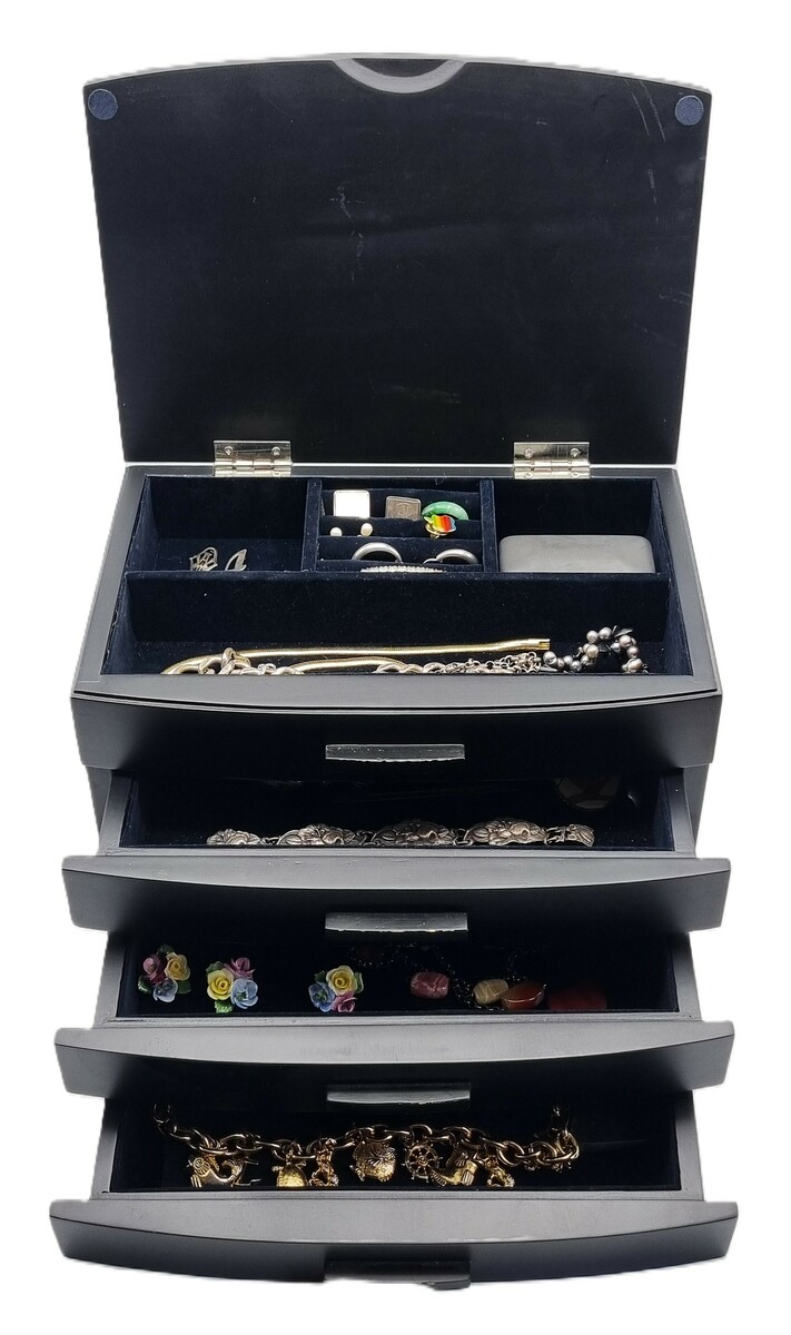 Een eclectische verzameling sieraden uit de 20e eeuw, opgeborgen in een donkerkleurige houten sieradendoos met meerdere laden. De collectie bestaat uit een mix van materialen zoals metaal, parels, halfedelstenen, emaille en plastic. Het bevat verschillende sieraden zoals broches, kettingen, oorbellen, ringen en manchetknopen, variërend in stijl van Art Deco tot moderne ontwerpen.