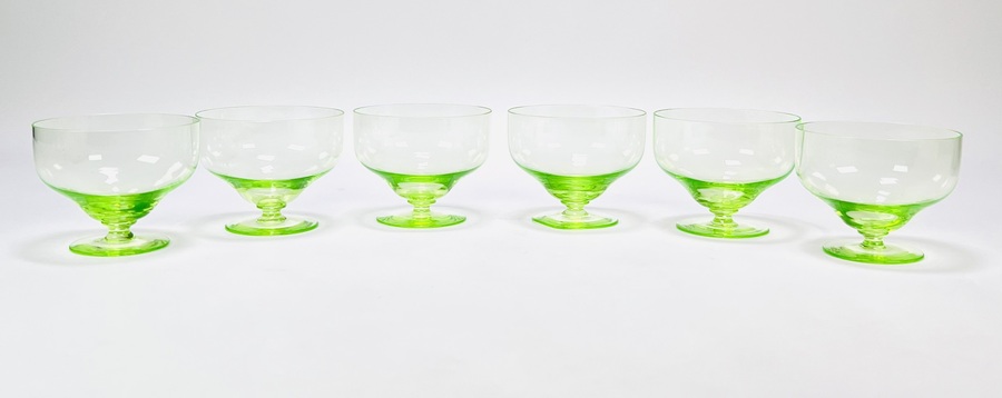 Set van zes Art Deco coupes, circa 1930–1940, uitgevoerd in transparant uraniumglas, fluorescerend onder UV-licht. Handgeblazen met geprofileerde stam en ronde voet, Europese makelij. Opvallend zijn de strakke kelkvorm en heldere groene gloed onder blacklight, kenmerkend voor interbellum-glaswerk.