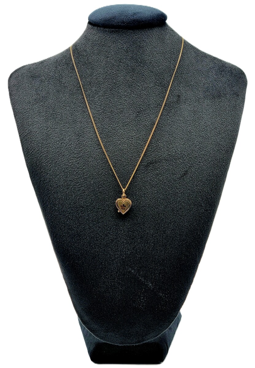 Een gouden ketting met een hartvormige hanger, gedateerd midden 20e eeuw. De ketting is gemerkt met 750 (18 karaat goud), terwijl de hanger is gemerkt met 333 (8-karaats goud). De hanger kan geopend worden en is aan de buitenzijde gedecoreerd met gegraveerde patronen en een strik.