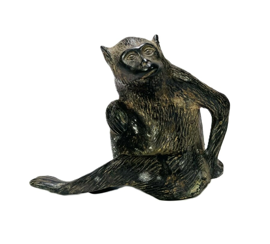 Klein bronzen beeldje van een zittende aap, uitgevoerd in verlorenwasmethode en voorzien van een donkere patina met groene oxidatie. Expressieve stilering met aandacht voor houding en gelaatsuitdrukking. Datering midden tot derde kwart 20e eeuw. Het oppervlak vertoont sporen van handmatige afwerking en gebruiksslijtage op de verhoogde delen.