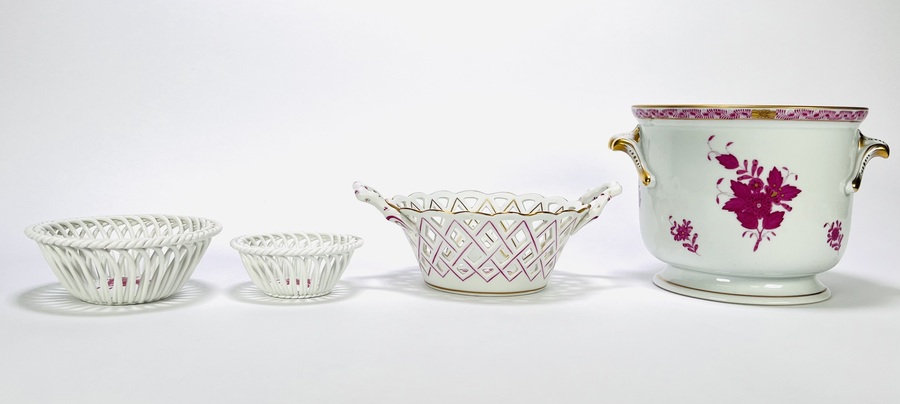 Vierdelig porselein ensemble van Herend (opgericht 1826), uitgevoerd in handbeschilderd porselein. De set omvat een bloempot, een opengewerkte mand met ruitpatroon en twee kleinere gevlochten mandjes. Gedecoreerd in puce met florale motieven en goudklurige accenten. Allen gemerkt onderzijde, Hongarije, midden 20e eeuw.