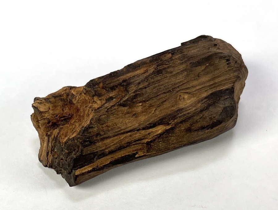 Versteend hout, gevonden in Markelo, ontstaan via natuurlijke fossilisatie waarbij hout over miljoenen jaren werd omgezet in siliciumdioxide. Onbewerkte vorm met zichtbare jaarringen en vezelstructuur. Het oppervlak toont natuurlijke breuklijnen en verkleuringen van beige tot donkerbruin.