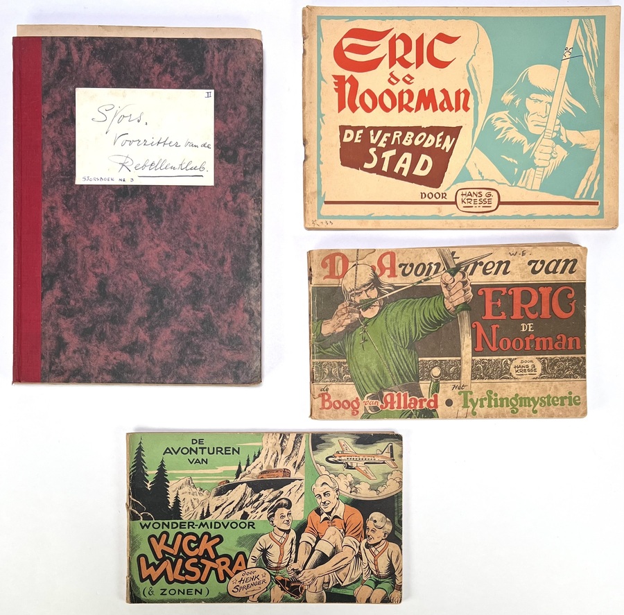 Collectie strip- en jeugdpublicaties uit omstreeks 1948–1955, met werk van Hans G. Kresse (1921–1992) en Henk Sprenger (1919–2005). Gedrukt op papier met offsettechniek. Bevat titels als “Eric de Noorman” en “Kick Wilstra”. Omslagen in tweekleurendruk, binnenwerken in zwart-wit. Typisch voor Nederlandstalige beeldverhalen uit de vroege naoorlogse periode. Eén bundel bevat handschrift op de omslag.