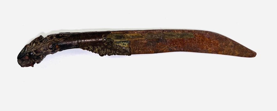 Traditionele dolk (piha kaetta) uit Sri Lanka, omstreeks begin 20e eeuw, bestaande uit een gekromde gesmede stalen kling, een met koperlegering beslagen middenstuk en een uitgesneden houten greep in dierlijke vorm met metalen inleg. Handgemaakt ceremonieel wapen met symbolische en regionale motieven.