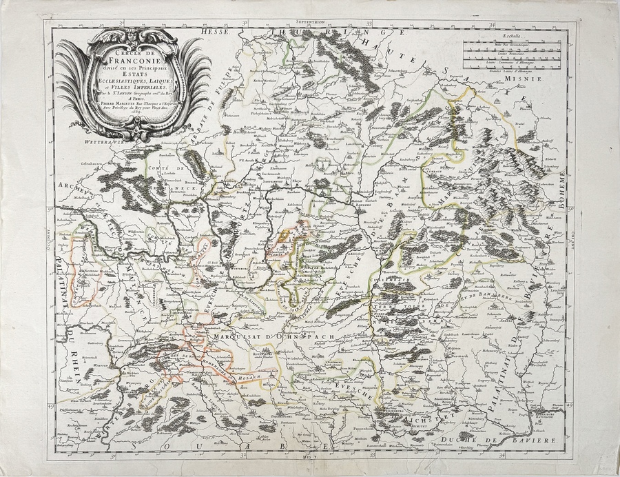Kaart van het "Cercle de Franconie", circa 1740, toegeschreven aan Jean-Baptiste Nolin II (1686–1762). Kopergravure op handgeschept papier met met de hand ingekleurde grenzen. De kaart toont het Frankenland binnen het Heilige Roomse Rijk, met politieke en geografische details, steden en reliëf. Linksboven een sierlijk cartouche in barokstijl met titel en opdracht.