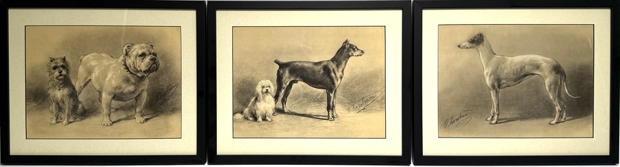 Set van drie litho's uit de map “Hondenrassen” door Otto Eerelman (1839-1926), uitgegeven in 1920. Uitgevoerd op papier in zwart met lichtbruine toon, elk blad toont honden in naturalistische stijl op neutrale achtergrond. De honden zijn afgebeeld in rusthouding, met nadruk op raszuivere kenmerken. Gesigneerd in de plaat.