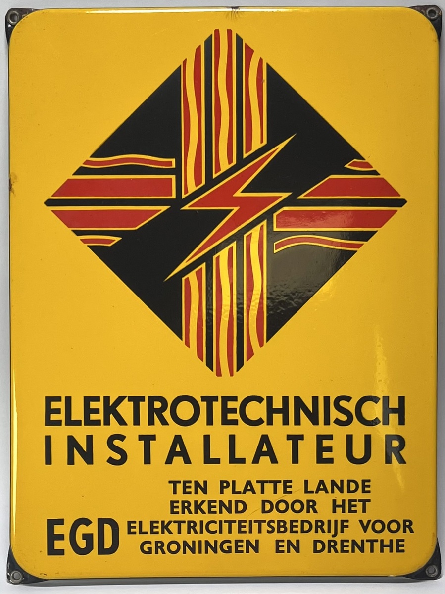 Emaille bord, uitgevoerd in metaal met industriële zeefdruktechniek, omstreeks 1950. met een gestileerde bliksemembleem in rood, geel en zwart op een gele ondergrond. Het object diende als erkenningsbord voor elektrotechnische installateurs, aangesloten bij het Elektriciteitsbedrijf voor Groningen en Drenthe (EGD). Voorzien van montagegaten in de hoeken en duidelijke functionele typografie.