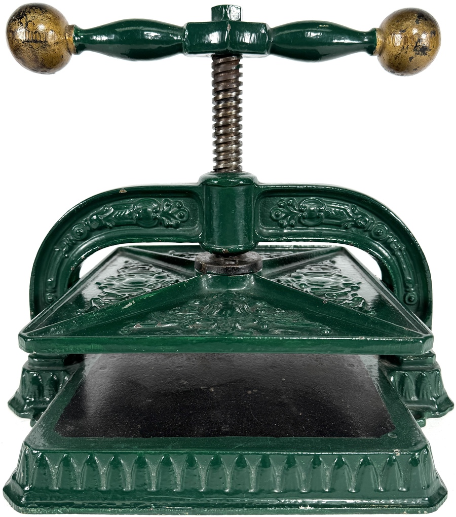 Gietijzeren boekdrukpers, eind 19e eeuw. Functioneel object met florale decoraties in neostijl, voorzien van een schroefmechaniek met ronde messing knop. De pers bestaat uit een zwaar uitgevoerde voetplaat met opstaande rand, kruisvormige drukplaat en verticale spindel, groene lakafwerking.