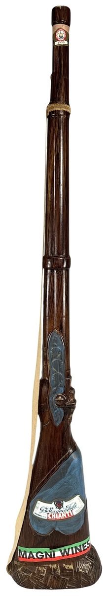 Mid-century novelty drankfles in de vorm van een geweer, door G.E. Magni & Figli, Chianti. Omstreeks 1955–1965. Beschilderde fles met kurk, papieren banderol en etiketten; textiele draagband. Met etiketten ‘G.E. Magni & Figli Chianti’ en ‘Magni Wines’. Kenmerken: trompe-l’œil houtnerf, blauwe panelen, halszegel met jaartal 1955, opschrift op voet, decoratieve kolf en slot in reliëf.