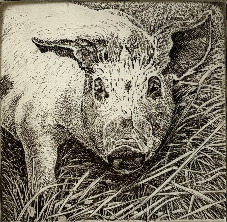 Ets “Het varken” gemaakt door kunstenaar Han van Hagen (Voorburg, 1944) in opdracht van de toenmalig directeur van het Rijksdienst voor de keuring van Vee en Vlees (RVV) mr. drs. P. Cloo, als relatiegeschenk voor de medewerkers van het RVV. Bioloog en schrijver Midas Dekkers (Haarlem, 1946) heeft bij de ets een tekst gemaakt. Deze eerste ets uit een serie is van een vier maanden oud varken. Linksonder gesigneerd en rechtsonder genummerd en gedateerd: Han van Hagen, RVV prent I, 2000.