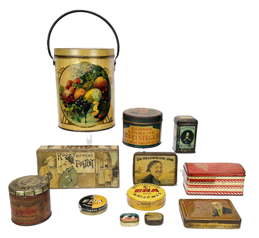 Verzameling van 12 reclameblikken uit begin tot midden 20e eeuw, vervaardigd door diverse Nederlandse producenten zoals La Bolsa Kampen en Deventer Waschmiddelenfabriek. Vervaardigd uit bedrukt blik met lithografische decoratie in commerciële stijl. De ontwerpen omvatten portretten, stillevens, typografie en productinformatie. Bedoeld voor huishoudelijke en voedingsmiddelen zoals tabak, stroop, cacao en wasmiddelen.