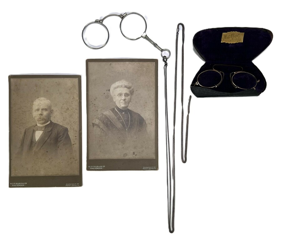 Set bestaande uit twee eind 19e-eeuwse portretfoto’s (albuminedruk, gesigneerd midden onder met "W. & Z. Munsa & Co, Amsterdam"), een lorgnet aan ketting en een pince-nez in fluwelen etui met gedrukt label “Hütter – Leipzig”. De brillen zijn vervaardigd uit metaal.