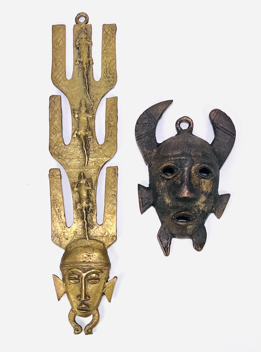 Twee West-Afrikaanse maskers, tweede helft twintigste eeuw. In Dogon- en Senufo-stijl, gegoten messing met de verloren was methode (cire perdue). Eén lang verticaal masker met drieledige vorkvorm, gestileerd hoofd met baard; één kleiner hoornmasker, open ogen en mond, donkere patina. Kerfdecoraties en gegoten details zichtbaar aan voorzijde. Achterzijde voorzien van ophangogen, regio Mali/Ivoorkust.