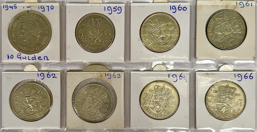 Set van acht Nederlandse munten geslagen door de Koninklijke Nederlandse Munt: zeven rijksdaalders van 2,50 gulden uit 1959, 1960, 1961, 1962, 1963, 1964 en 1966, plus 10 gulden 1970 ‘Nederland herrijst’. Materiaal: zilver 720/1000. Techniek: stempeldruk. Met rechtsgericht portret van koningin Juliana en keerzijde met gekroond rijkswapen en denominatie.