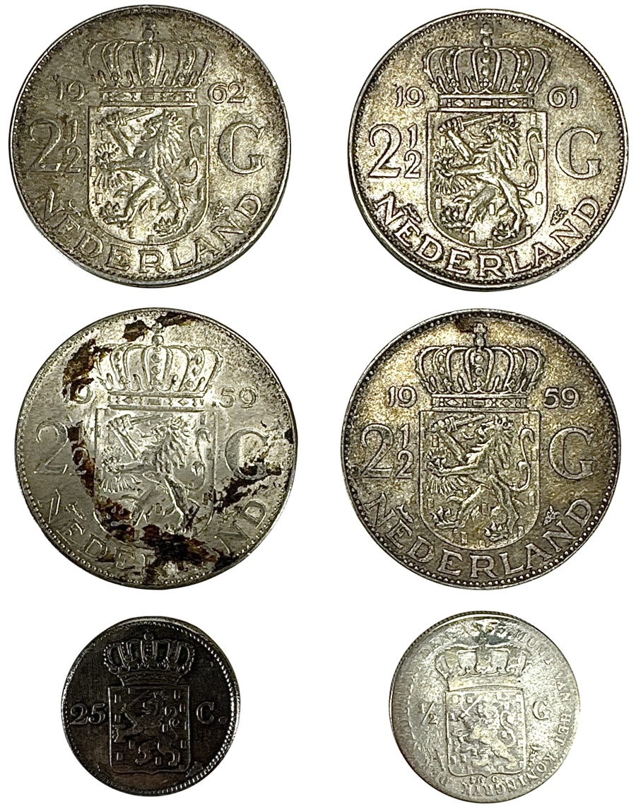 Zilveren Nederlandse munten bestaande uit vier rijksdaalders Juliana 2½ gulden met jaartallen 1959 (twee stuks), 1961 en 1962, de data onderaan de keerzijde; een kwartje 1829 met gekroonde W op voorzijde en “25 C.” op keerzijde; en een halve gulden Willem III met bebaard portret en gekroond wapen.