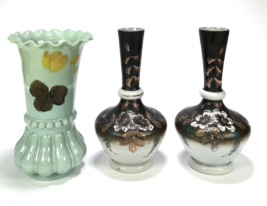 Drie opaline glazen vazen, midden 20e eeuw, bestaande uit een celadon groene vaas met gegolfde rand en ribstructuur, en een paar buikvormige vazen met smalle hals, zwart-wit-bruin kleurverloop en florale beschildering met goudkleurige accenten.