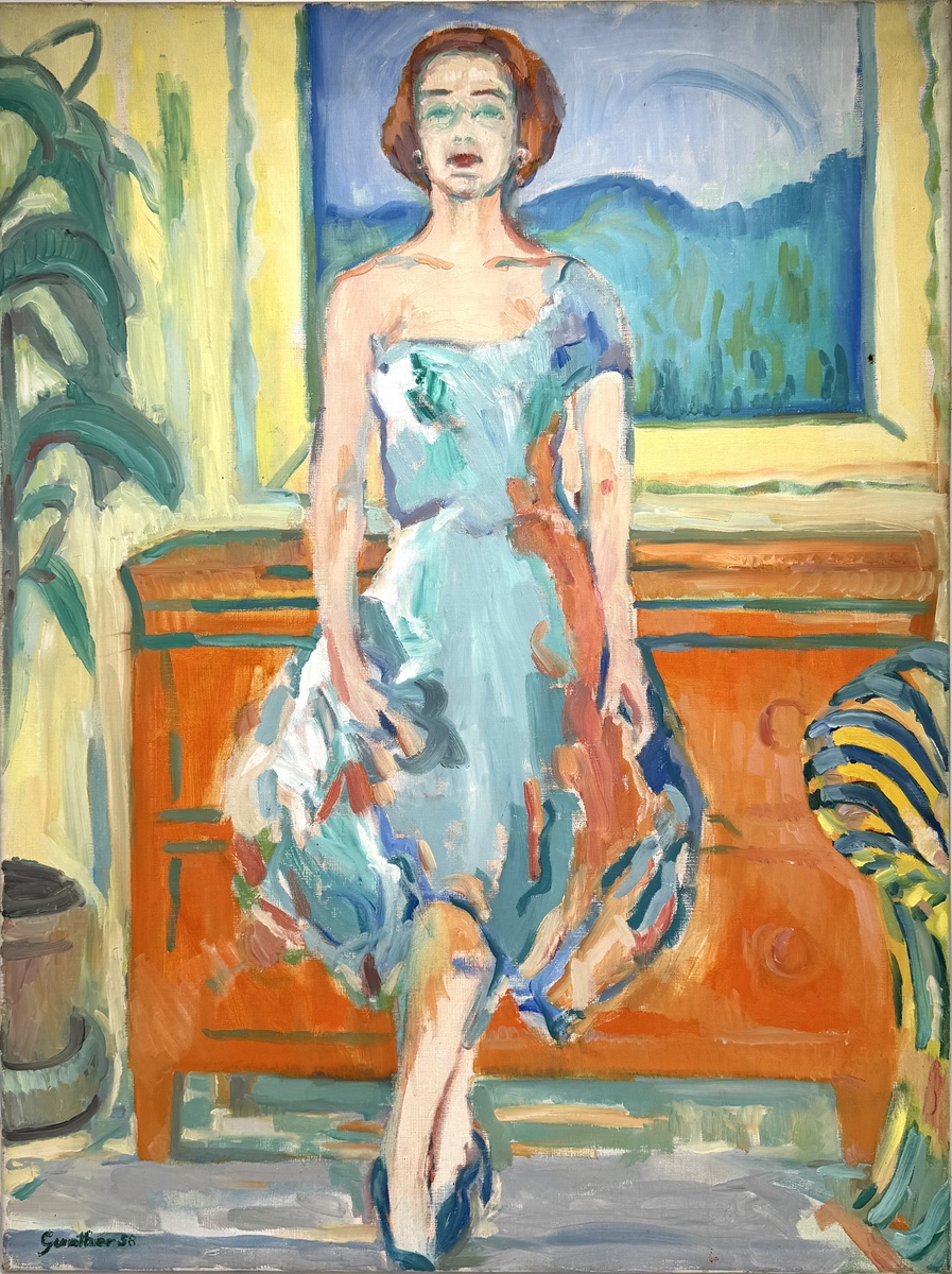 Schilderij door Gunther, gedateerd 1958, uitgevoerd in olieverf op doek. De voorstelling toont een vrouw in blauwe japon in een kleurrijk interieur met kast, fauteuil en plant. Expressionistische stijl met brede penseelstreken en contrasterend kleurgebruik. Linksonder gesigneerd en gedateerd “Gunther 58”.