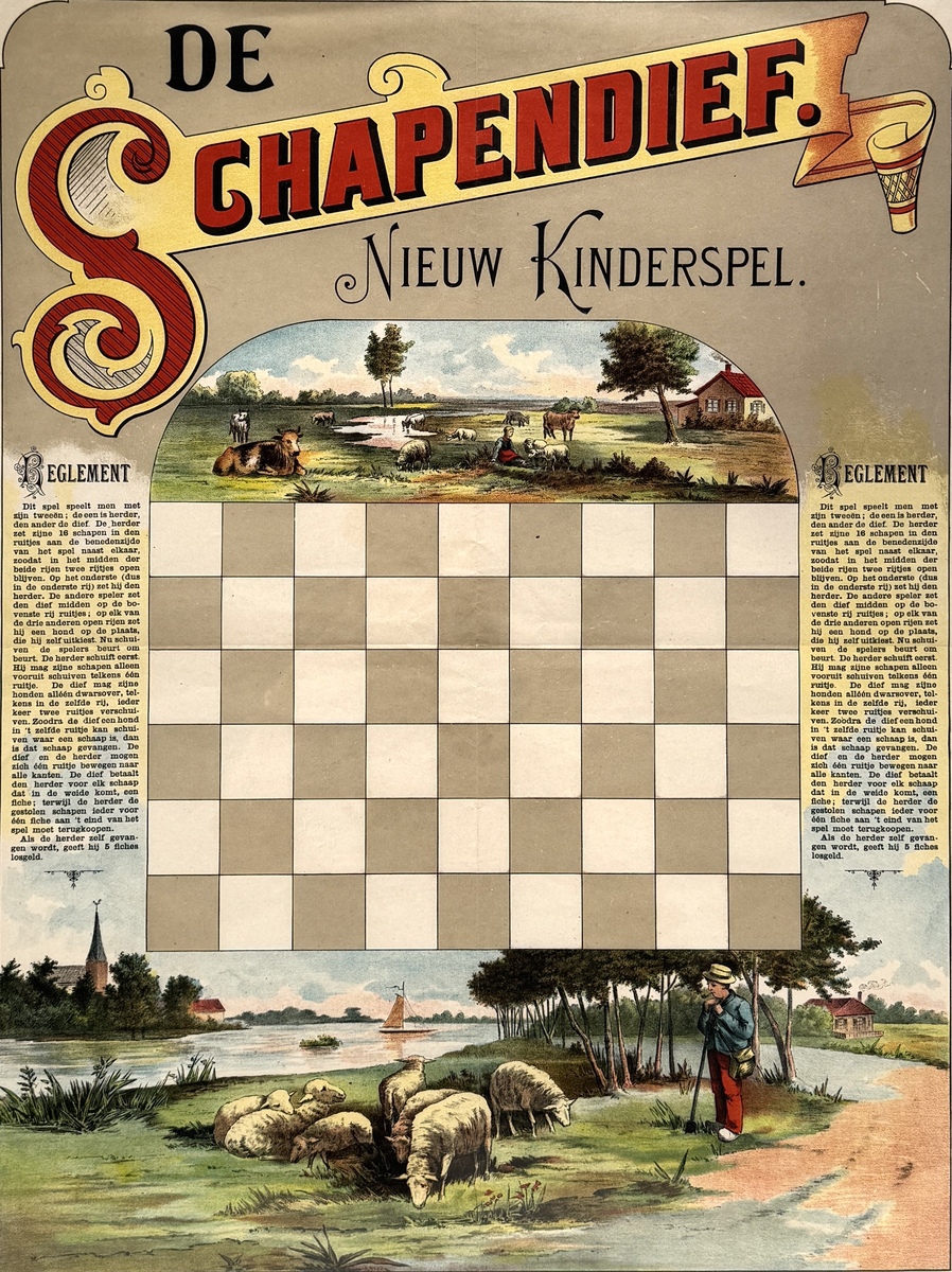 Bordspel “De Schapendief – Nieuw Kinderspel”, uitgegeven door B. Jacobs, Groningen, circa eind 19e eeuw. Uitgevoerd in papier op karton, gedrukt in chromolithografie. Centraal schaakbordachtig speelveld met 8x8 vakken, omlijst door landschappelijke taferelen met herders, schapen, koeien, boerderij en rivier met molen en kerk. Links en rechts gedrukt spelreglement in sierlijke negentiende-eeuwse typografie.