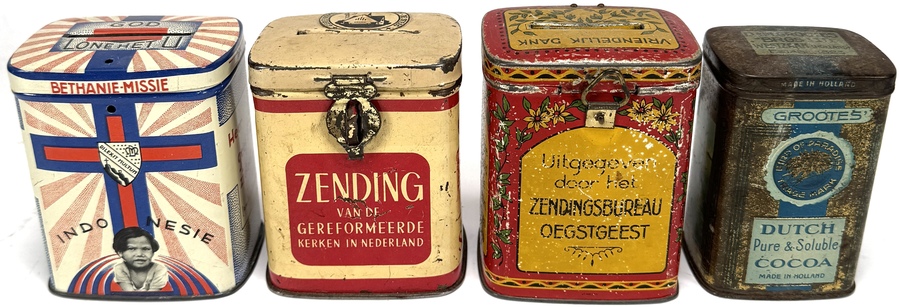 Set van vier Nederlandse metalen blikken, midden twintigste eeuw, met lithografische bedrukking. Bestaand uit drie missionaire spaarbussen met teksten over zendingsarbeid in Oost- en West-Indië, religieuze en koloniale voorstellingen, en een reclameblik “Dutch Girl Brand” cacao.