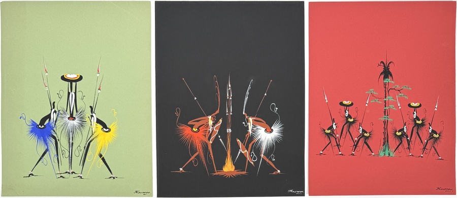 Drie tekeningen van Koumou uit circa 1955–1965 uitgevoerd op groen, zwart en rood gekleurd karton. Voorstellingen van gestileerde Afrikaanse krijgers met speren en schilden, in symmetrische opstelling en met felgekleurde accenten. Alle drie rechtsonder gesigneerd “Koumou”.