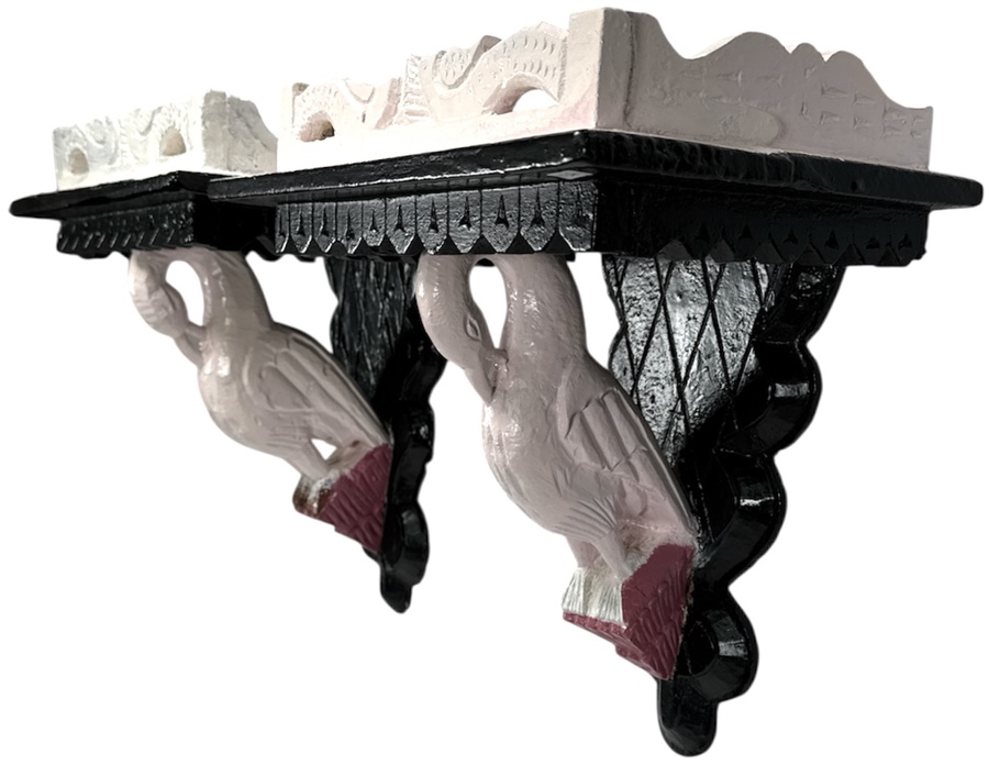Set van twee houten wandconsoles, midden 20e eeuw, uitgevoerd in gesneden en gepolychromeerd hout in zwart, wit, roze en rood. Voorzien van opengewerkte zijpanelen en hoogreliëf vogels als dragend element. Met originele ophangvoorziening aan de achterzijde.