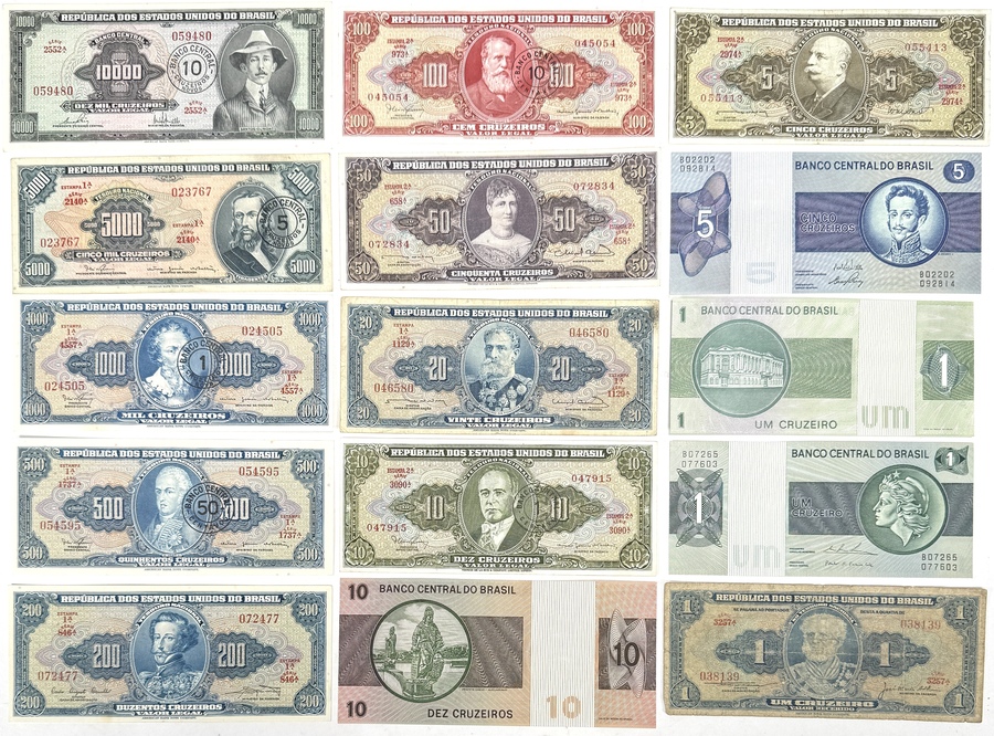 Verzameling van 15 Braziliaanse bankbiljetten uitgegeven door Banco Central do Brasil en República dos Estados Unidos do Brasil, midden tot eind 20e eeuw. Gedrukt op bankbiljetpapier met hoogdruk en diepdruktechniek. Inclusief coupures van 1 tot 10.000 cruzeiro's, met allegorische figuren, staatslieden, militaire scènes en architectuur. Voor- en achterzijden in beeld, diverse emissies en stijlen vertegenwoordigd.