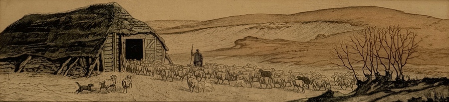 Kleurenets/aquatint op papier van Tjeerd Bottema (1884–1978), getiteld "Naar de kooi", uit circa 1915–1930. Realistische voorstelling van duinlandschap met rietgedekte schaapskooi, herder, honden en kudde schapen. Rechtsonder in de plaat gesigneerd. In goudkleurige lijst met passe-partout.