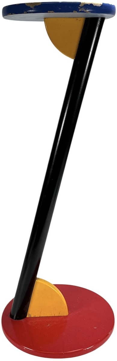 Een bijzettafel in een postmoderne Memphis stijl, daterend van uit de jaren '80. De bijzettafel is vervaardigd van gelakt hout in de primaire kleuren rood, blauw, geel en zwart. De bijzettafel bestaat uit geometrische vormen, de schuine stand van de poot is een kenmerkend visueel detail.