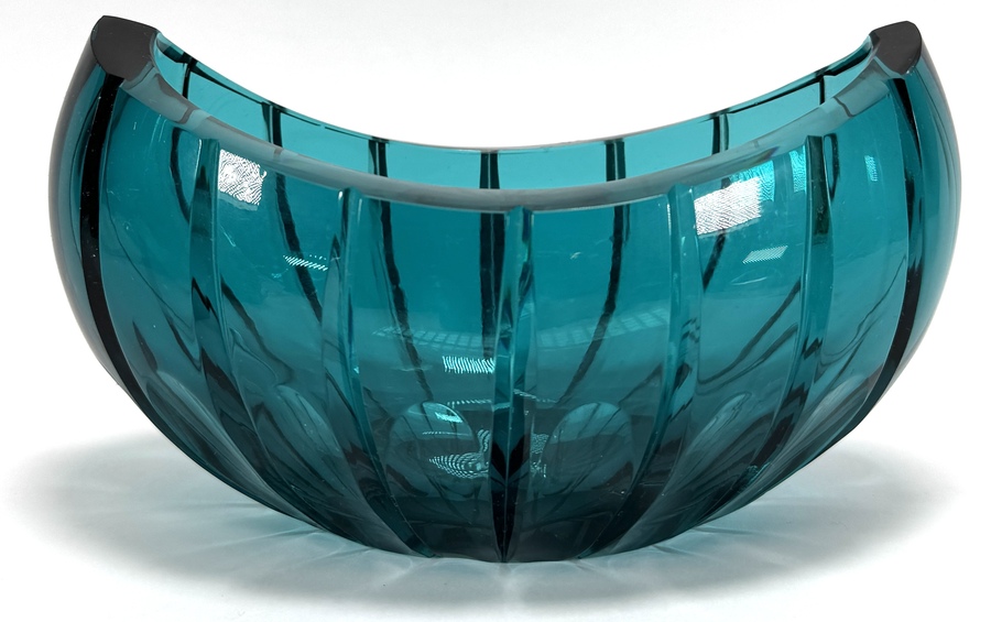Halfronde schaal van Jakub Hříbal (geboren 1982), omstreeks 2016, in massief turquoise kristalglas met zwarte randen. Handgeslepen, gepolijst en facetgeslepen met verticale segmenten en stervormig slijppatroon in de binnenzijde. Onderzijde gegraveerd gesigneerd “J. Hříbal”.