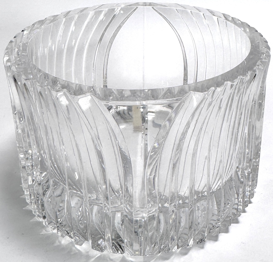 Gesigneerde kristallen schaal van Stanislav Klemeš, 1991, Tsjechië. Handgeslepen en gepolijst loodkristal met architectonisch lamellenmotief rondom, lensvormige kern en scherpe getande rand. Op de rand gegraveerd “Klemeš 1991”; tevens papieren fabriekssticker met sterlogo en jaartal 1856 aanwezig.