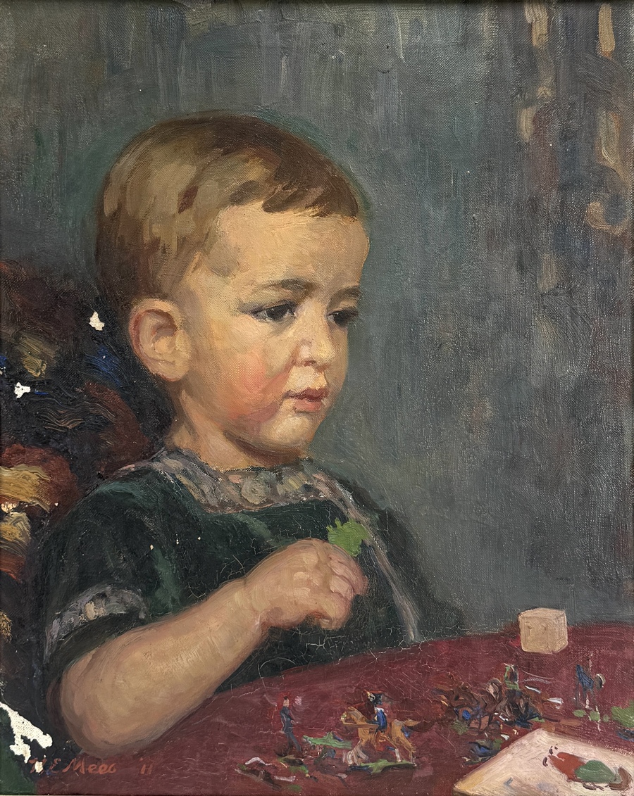 Schilderij van Herman Ellen Mees (1880–1964), 1911, olieverf op doek. Realistisch portret van een jong kind spelend aan tafel met miniatuurfiguren en een kubus. Uitgevoerd in warme, gedempte kleuren met zorgvuldige penseelvoering. In goudkleurige lijst, opgespannen op houten spielatten. Gesigneerd en gedateerd linksonder “H.E. Mees ’11”.