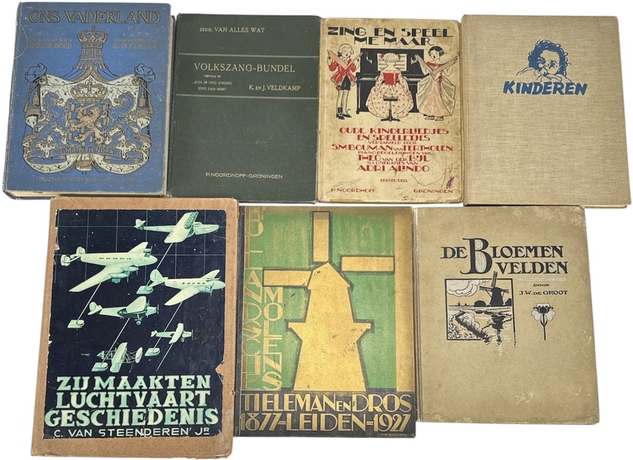 Convoluut van zeven Nederlandse kinder- en jeugdboeken, diverse auteurs en uitgevers (o.a. P. Noordhoff, Groningen), circa 1920–1950. Papier en karton, deels linnen gebonden; boekdruk met lithografische omslagen. Titels omvatten ‘Ons Vaderland’, ‘Volkszang-bundel’, ‘Zing en speel me maar’, ‘Kinderen’, ‘Zij maakten luchtvaartgeschiedenis’, ‘Hollandsche Molens 1877–1927’ en ‘De Bloemenvelden’. Meerdere banden met blindstempel, opdruk en sierlijke schutbladen.