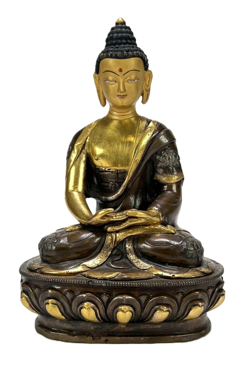 Zittende Boeddha in traditioneel Tibetaans-Boeddhistische stijl, uitgevoerd in verguld en gepatineerd brons, omstreeks eind 20e eeuw. De Boeddha is weergegeven in meditatiehouding op een rijkelijk gedecoreerde lotustroon. Met florale gravures in de gewaden en een gesloten onderzijde met rode lak en centraal mandalasymbool.