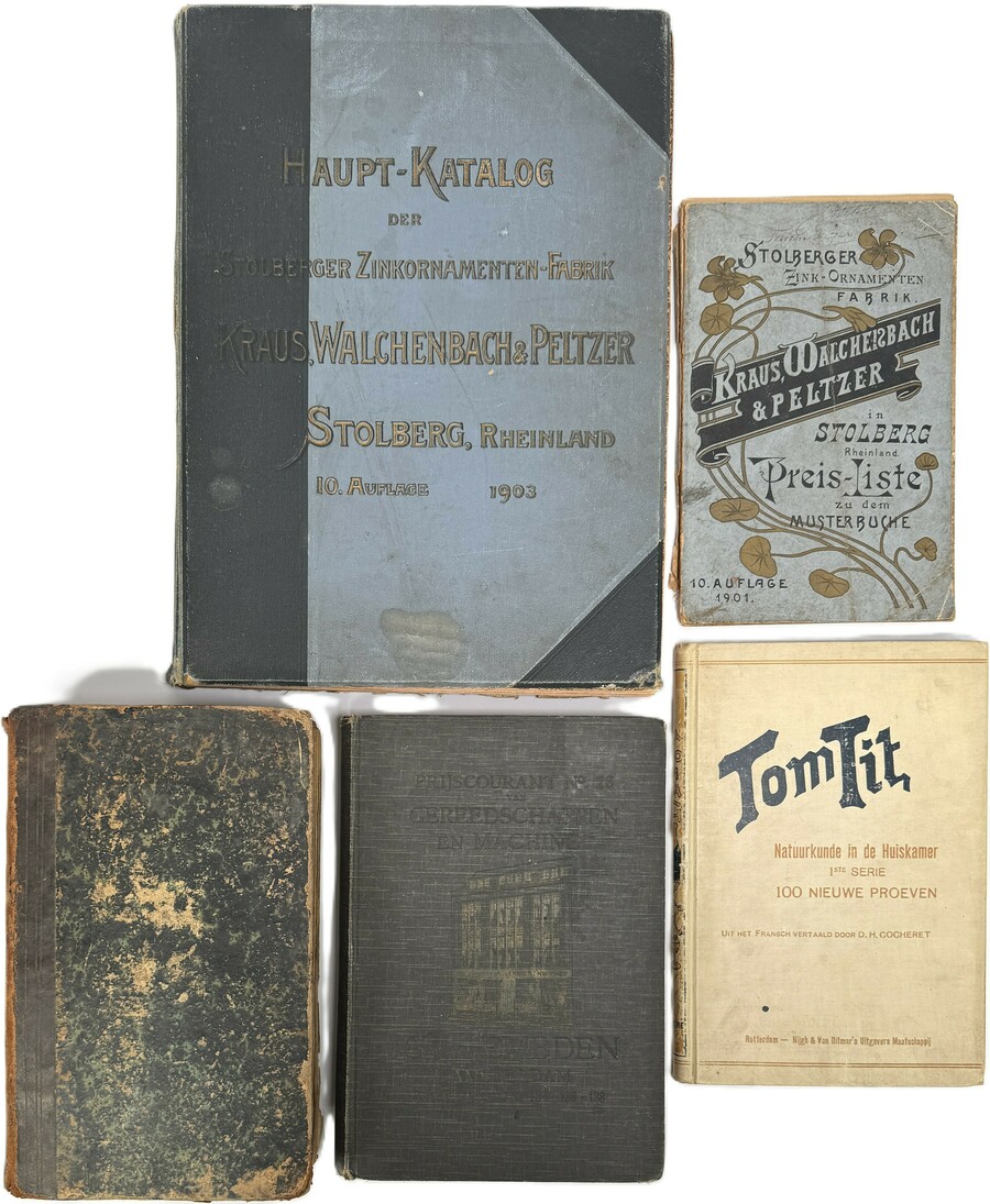 Vijf boeken/catalogi: ‘Prijscourant no. 26 van gereedschappen en machine’ - S. van Embden, ‘Preis-liste zu dem musterbuche, Stolberger Zink-Ornamenten Fabrik - Kraus, Walchenbach & Peltzer, ‘Natuurkunde in de huiskamer’ - Tom Tit (vertaling D.H. Cocheret), ‘Nederlandsche Apotheek’ (‘s Gravenhage, ter Algemeene Lands-drukkerij, 1851) en ‘Haupt-Katalog der Stolberger Zink-Ornamenten Fabrik’ - Kraus, Walchenbach & Peltzer.