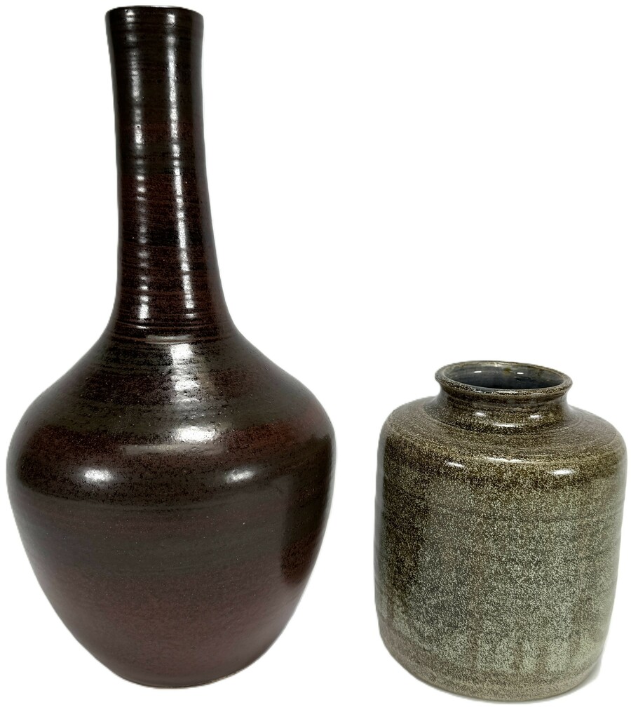 Twee aardewerken vazen in naoorlogse modernistische stijl: een vaas met langgerekte hals, onderzijde gesigneerd Zaalberg, ca. 1960; de tweede cilindrische vaas, onderzijde gesigneerd Dick 65. Vazen met ijzerbruine en grijsgroene glazuren.
