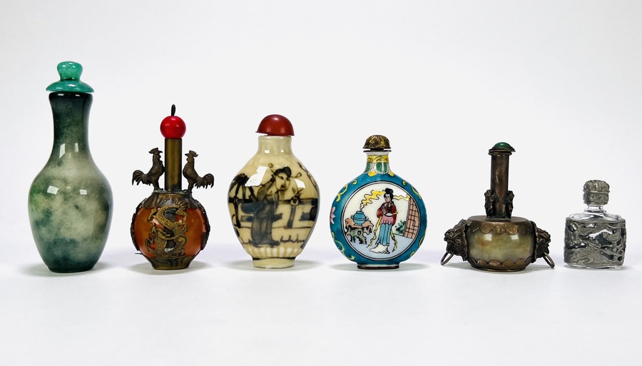 Zes Chinese snuifflesjes, eind 19e eeuw tot midden 20e eeuw, uitgevoerd in glas, porselein en metaal. Technieken omvatten cloisonné, penseelschildering en gietwerk met draken- en figuurmotieven. Elk flesje is voorzien van een passende dop, deels met lepel. De ontwerpen tonen traditionele Chinese symboliek, zoals leeuwenmaskers en vrouwenfiguren.