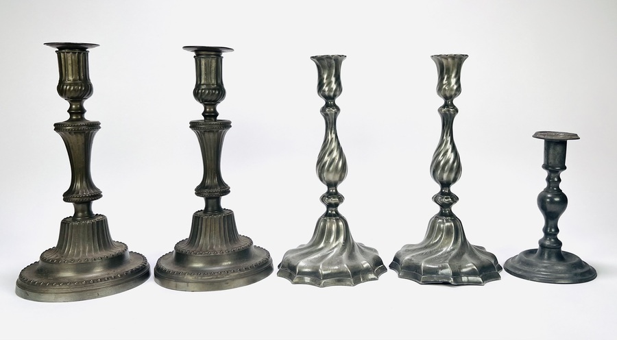 Vijf kandelaren in twee paren en één enkel exemplaar, uitgevoerd in gegoten tin, eind 19e eeuw tot begin 20e eeuw. Twee neoclassicistische exemplaren met ovalen voet en verticale cannelures, twee met een tors gevormde balusterstam en gelobde voet en één eenvoudig balustermodel.