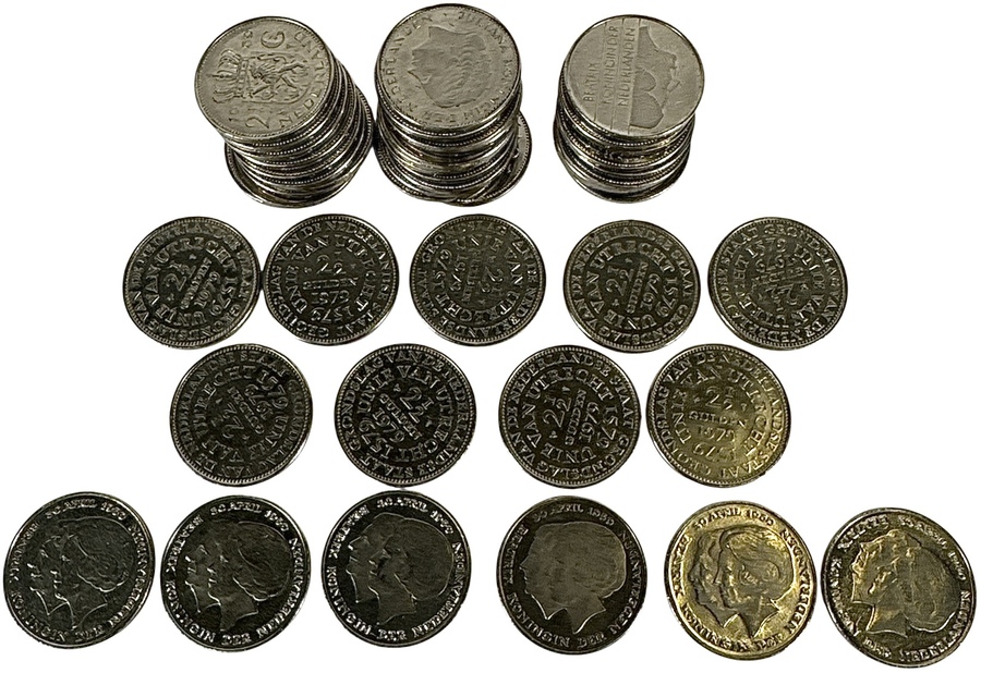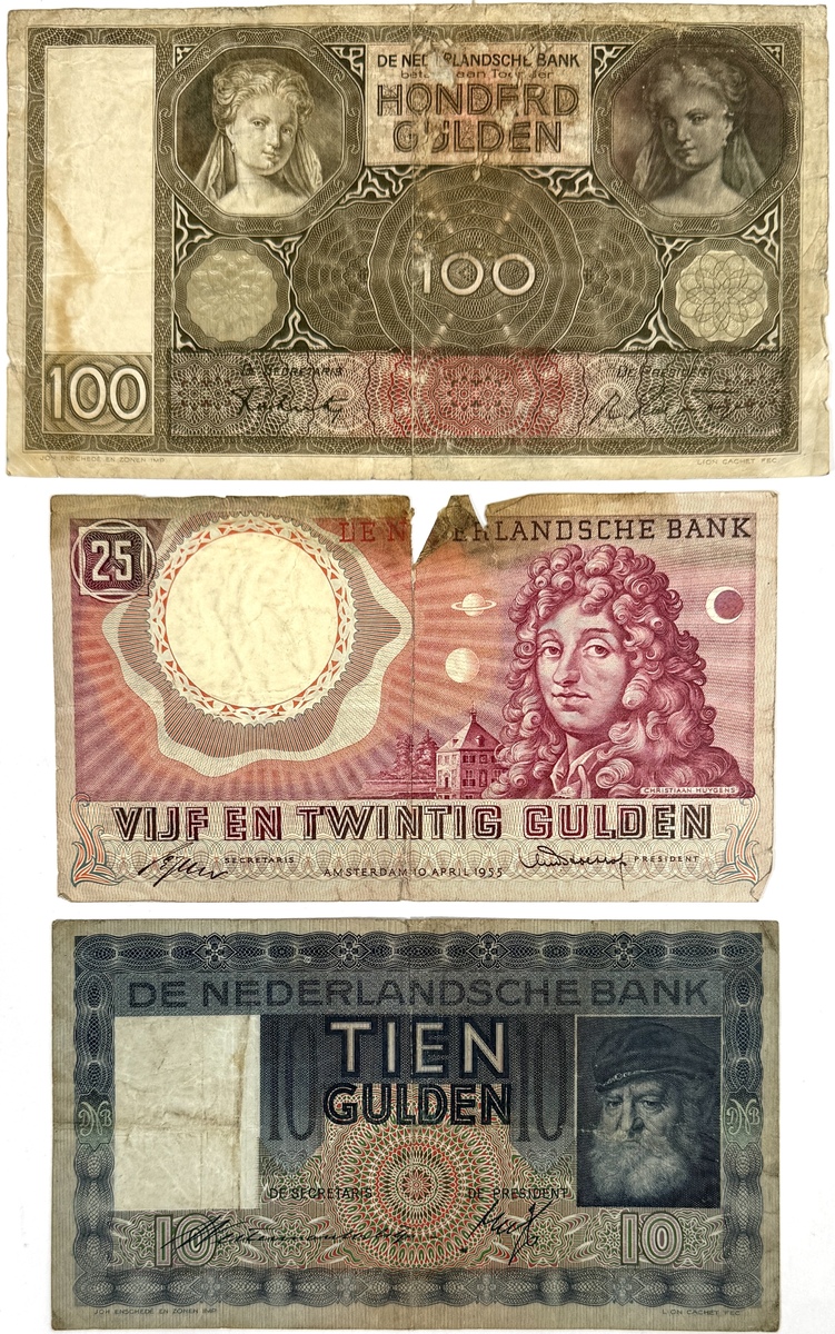 Drie Nederlandse bankbiljetten 100, 25 en 10 gulden exemplaren, uitgegeven door De Nederlandsche Bank, ontwerpen door onder anderen Lion Cachet (1864–1945) en gedrukt door Joh. Enschedé en Zonen, gedateerd 7 oktober 1942, 10 april 1955 en 11 november 1943. Uitgevoerd in bedrukt katoenvezel-bankpapier met meerkleurig diepdruk- en steendrukprocedé, portretten van Christiaan Huygens en Frans Hals, voorzien van serienummers en handtekeningen.