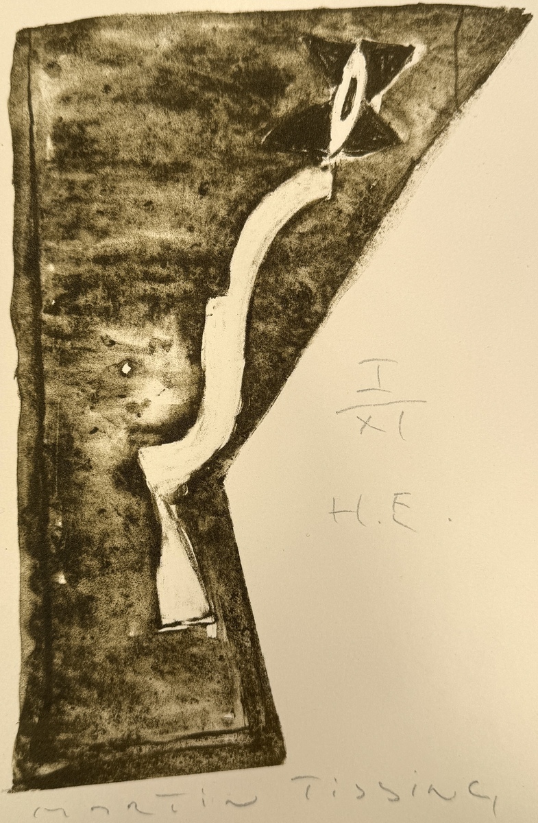Litho door Martin Tissing (1936–2021), uitgevoerd op papier in 1993. De abstracte compositie toont een geometrische vorm met witte lijnstructuur en stermotief, gedrukt in sepia- en zwarttinten. Onder met potlood gesigneerd, boven met potlood gedateerd en getiteld “aanwezig 1993”. Rechts naast de voorstelling aanduiding “I/XI” en “H.E.”, verwijzend naar een hors commerce-exemplaar.