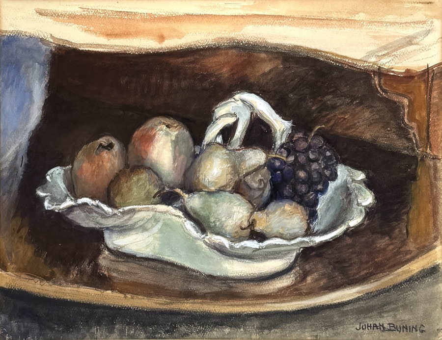 Stilleven van Johan Buning (1893–1963), gouache op papier, in figuratieve stijl met expressionistische elementen. Voorstelling van een fruitschaal met appels, peren en druiven op een donkere ondergrond, omlijst door warme bruine tonen. Het werk is rechtsonder gesigneerd. Datering: midden 20e eeuw.