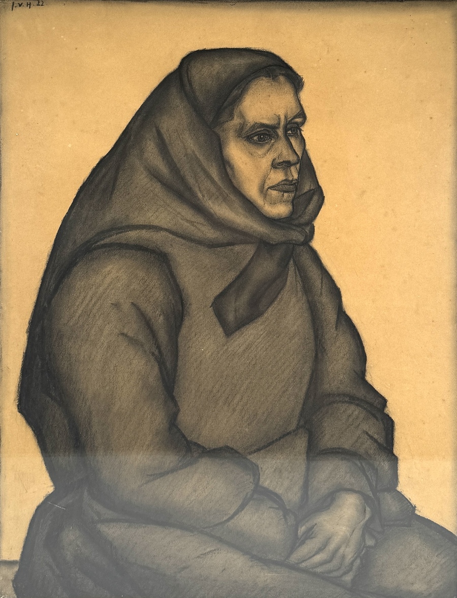 Houtskooltekening gedateerd 1922, linksboven gesigneerd met “J.v.H. 22”. De realistische voorstelling toont een zittende vrouw met hoofddoek in sobere, expressieve stijl. Uitgevoerd op getint papier in houten lijst.